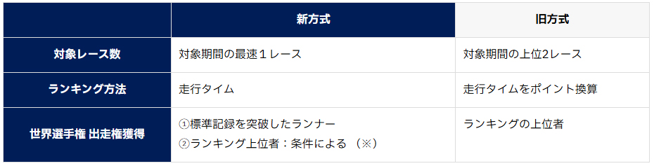新方式 旧方式 対象レース数 対象期間の最速1レース 対象期間の上位2レース ランキング方法 走行タイム 走行タイムをポイント換算 世界選手権 出走権獲得 - ①標準記録を突破したランナー